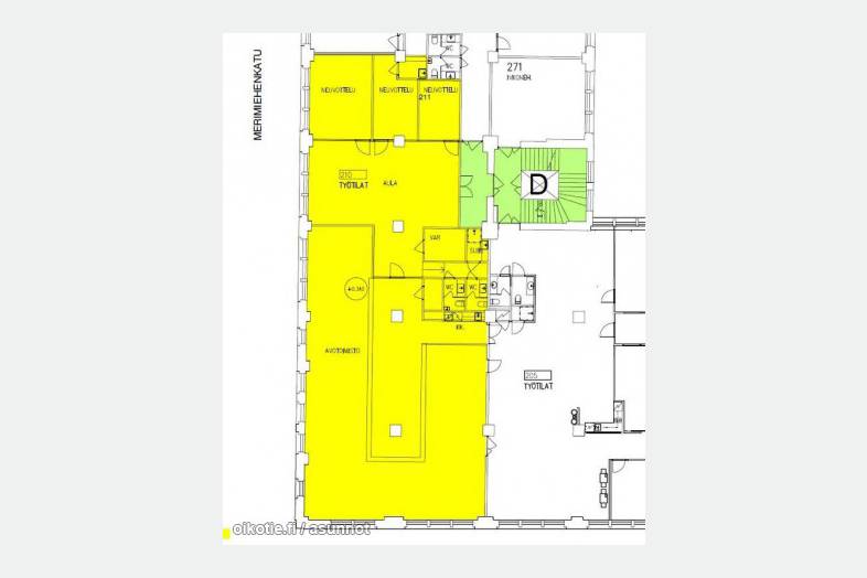 Merimiehenkadun toisen kerroksen monitilatoimisto, avotilaa ja huoneita . Omat sosiaalitilat ja keittiö.
