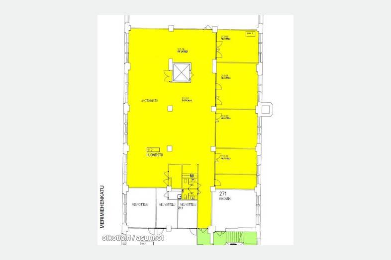 Merimiehenkadun toisen kerroksen monitilatoimisto, avotilaa ja huoneita . Omat sosiaalitilat ja keittiö.