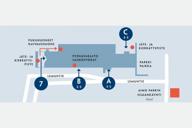 Akseli ja Elina tarjoaa ravintolapalvelut, säilytystilat pyörille sekä puku- ja pesutilat.