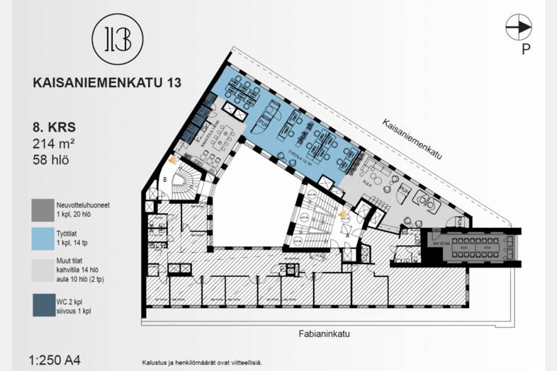 Vuokrataan kahdeksannen ylimmän kerroksen 214m2 toimistotila. Kerrokseen tulee kaksi henkilöhissiä. Toimistilaan on kaksi sisäänkäyntiä A -ja B- portaan kautta. Tilassa on kahdeksan lasitettuja toimistohuonetta sekä yksi isompi toimistohuone, iso neuvottuhuone sekä keittiö jonka yhteyteen saa tehtyä loungetilan. Kaisaniemenkatu 13 on valloittava toimitilakohde loistavalla paikalla Helsingin keskustassa. Vuonna 1929 valmistunutta kolmionmuotoista kiinteistöä voidaan pitää Kaisaniemen maamerkkirakennuksena. Aikakaudelle tyypilliset punatiiliset julkisivut on säilytetty alkuperäisessä asussaan.