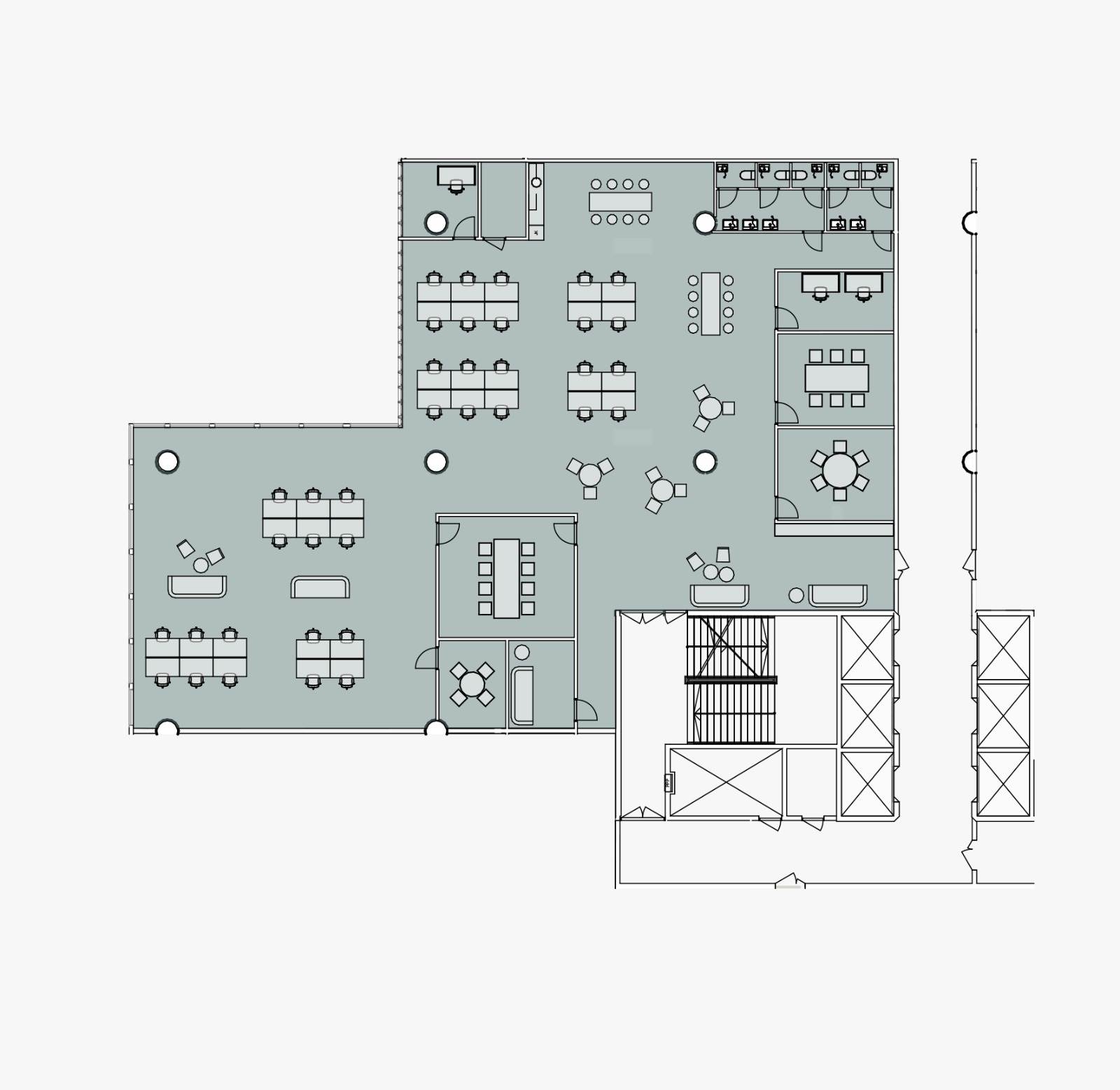 Vuokrattavan tilan pohjakuva esimerkkisovituksella, jossa 38 työpistettä.