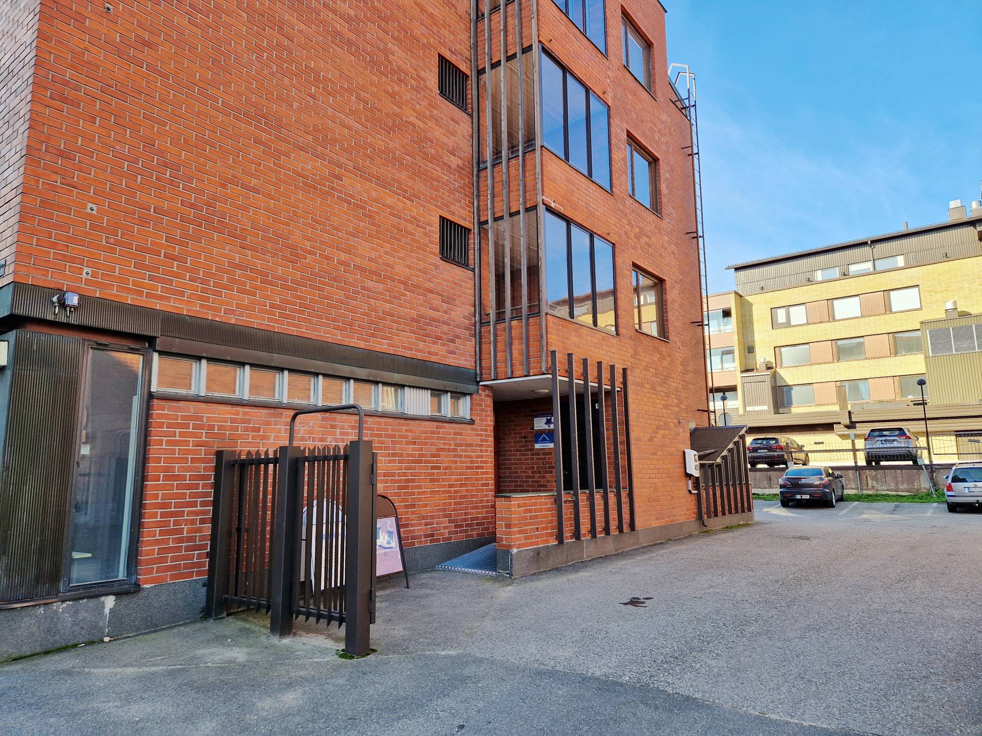 Sisäänkäynti, parkkipaikat rakennuksen takana
