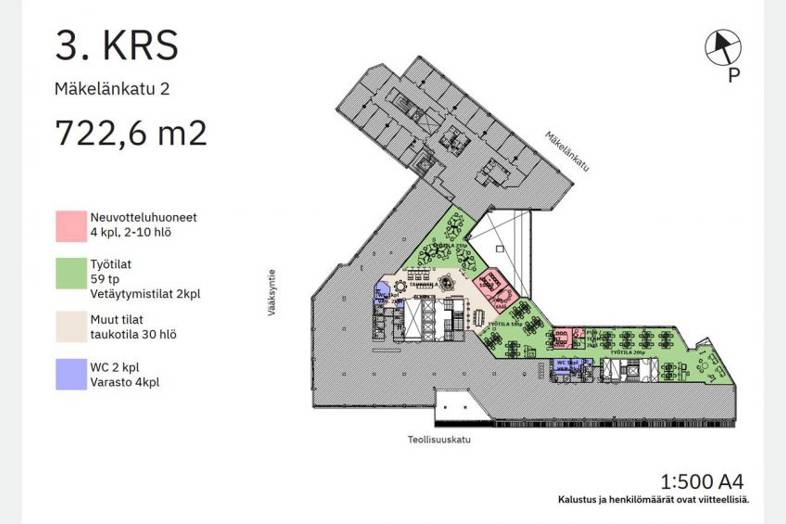 Vuokrattavana kiinteistön 3. kerroksen valoisa toimistotila 722,6 m². Tila voidaan suunnitella vuokralaisen tarpeiden mukaan. Tilaan voidaan yhdistää viereinen 1234,5 m²:n toimisto, jolloin kokonaisuus on 1957,1 m²:tä.