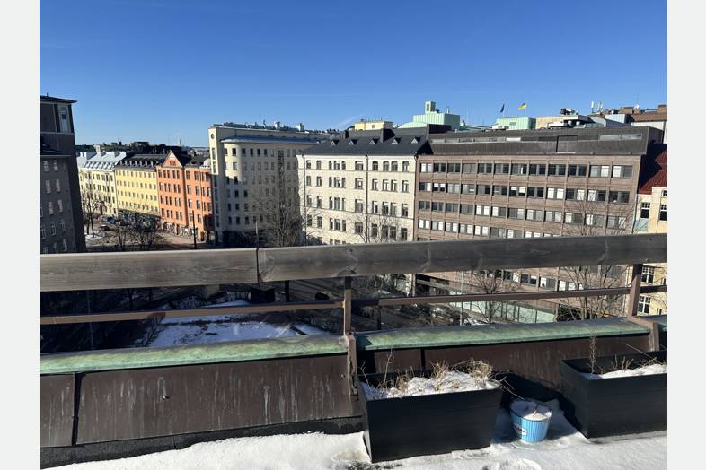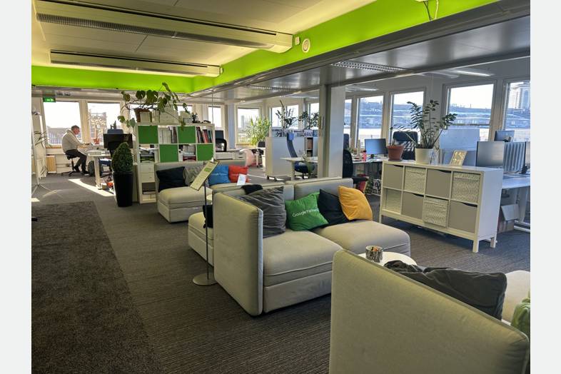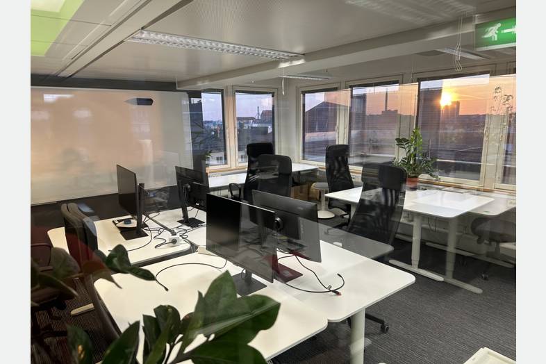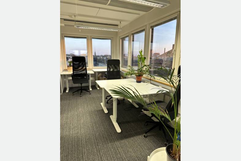 Työpiste Coworking-tilassa rakennúksen 9. kerroksessa, josta on hienot näkymät kattojen yli etelän suuntaan.