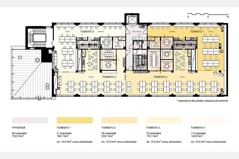 21 työpistettä, 166,1 m2 (sis. 10,6 htm2 osuus yleisaulasta)