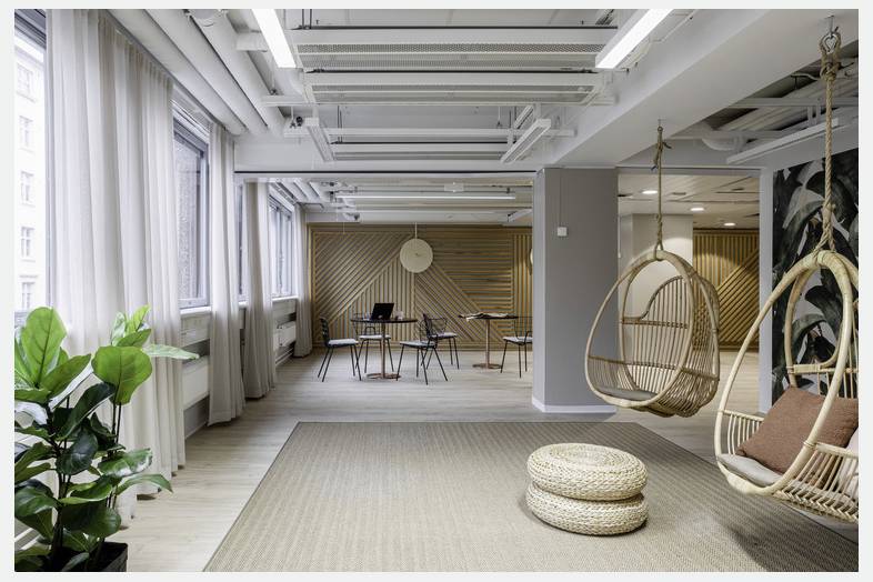 Siisti ja käyttäjän tarpeisiin mukautuva toimistotila Franzeninkadun puoleisessa siivessä. Oheinen pohjakuva on esimerkki tilankäytöstä.