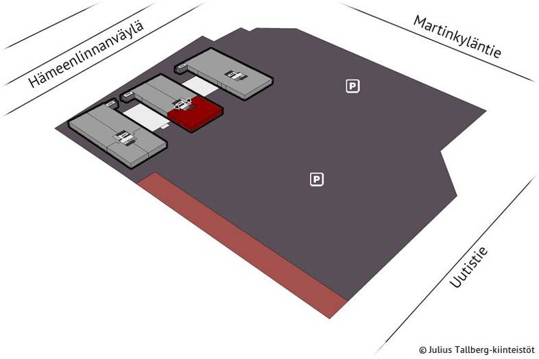 Kohteessa on runsaasti pysäköintipaikkoja, myös sähköautoille.