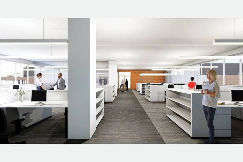Vapaana hyvätasoista toimistotilaa Aallonharjan B-talon viidennessä kerroksessa. Vapaa tila pystytään muokkaamaan käyttäjän toiminnan vaatimusten mukaisesti avotilaksi, huoneiksi tai näiden yhdistelmäksi. Pohjakuva osoittaa koko kerroksen, josta tila on jaettuna vuokrattavaksi.