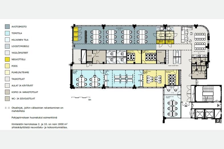 Viidennessä kerroksessa vapaana hyvä avotoimisto! Tämän tasokkaan kohteen tilat ovat modernisoitu vastaamaan nykypäivän vaatimuksia, suunnittelussa on panostettu yritystoiminnan kannalta tärkeään muunneltavuuteen, viihtyvyyteen, tehokkuuteen ja laatuun. Rakennuksen erityisen suuren kerroskoon ansiosta on suurenkin yrityksen henkilöstö istutettavissa yhteen kerrokseen ja samaan tasoon, taaten kuitenkin tarvittavat neuvotteluhuoneet, työtilat sekä keittiöt loungeineen.