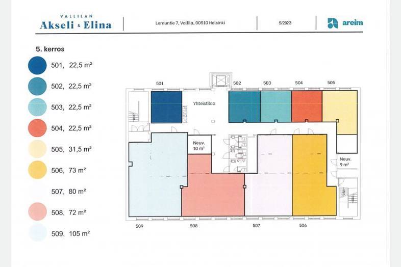 Kiinteistön 5. kerroksessa vuokrattavissa pientoimistoja alkaen 22,5 m². Vuokralaisten yhteiskäytössä on keittiö, wc-tilat sekä 2 neuvottelutilaa.