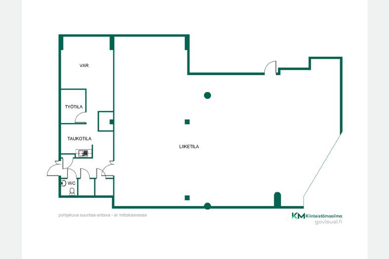 Tilava ja muunneltava tila sopii esimerkiksi vähittäiskauppaan, muotiliikkeeksi, vaatekaupaksi tai erikoismyymäläksi, kuten sisustus- tai lifestyle-kaupan tarpeisiin. Avaruutensa ansiosta tila mahdollistaa laajan tuotevalikoiman esillepanon ja tarjoaa reilusti tilaa sovitustiloille tai muille tärkeille myymälän toiminnoille.