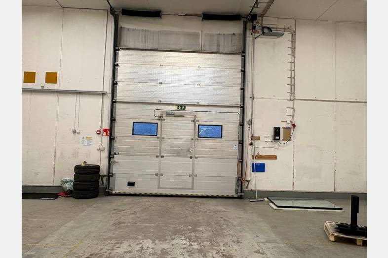 Hallin pääsee nosto-ovista jotka ovat 4m ja 3,5m korkeita. Leveys ovissa on 3,5m. Ovet toimivat sähköisesti.