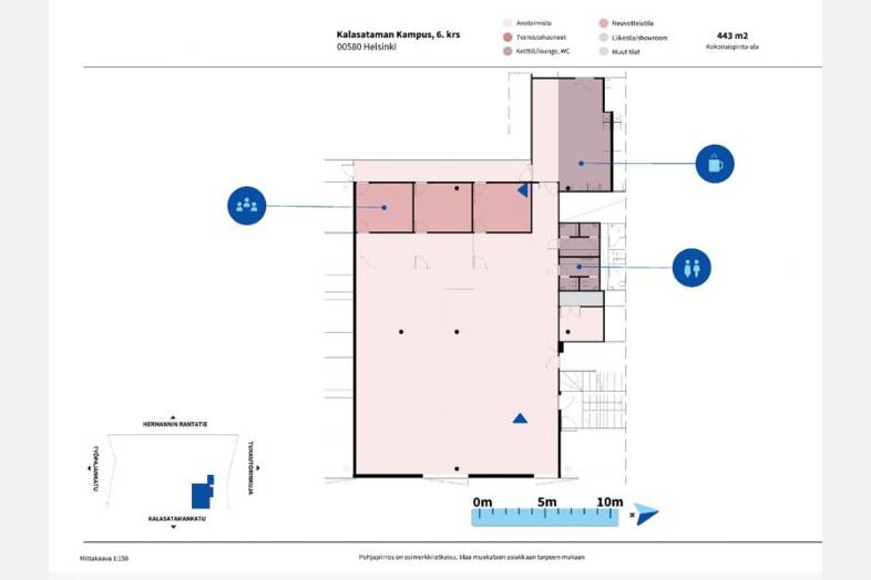 Kalasataman Kampus on huippumoderni toimistokokonaisuus, jossa on huomioitu erilaisten tilankäytön tarpeiden jatkuva eläminen. Tiloja voidaan helposti jakaa, yhdistellä ja muunnella talon elinkaaren eri vaiheissa. Kerroksiin tulee paljon luonnonvaloa suurten ikkunoiden ja kattoikkunarakenteen kautta. Talossa on runsaat palvelut, kuten aulapalvelu, neuvottelumaailma, auditorio, ravintola, kahvila, parkkihalli sähköauton latauspisteillä sekä pyörparkki sosiaalitiloineen. Kampuksen kerrospinta-ala on n. 1900 m², ja se voidaan helposti jakaa kahdelle, kolmelle tai neljälle käyttäjälle. Tilojen pohjaratkaisut räätälöidään vuokralaisen tarpeiden ja toiveiden mukaan. Ota yhteyttä ja sovi esittely, palvelumme on tilanhakijalle ilmainen.