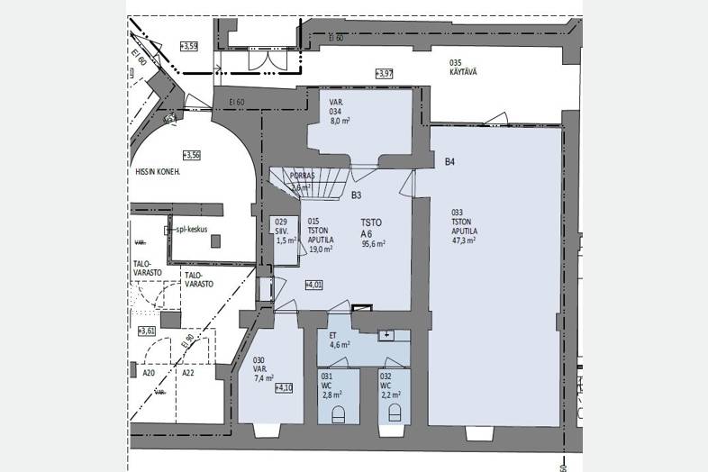 270 m² toimitila koostuu katutason 174,7 m² tilasta ja kellarikerroksen 95,6 m² tilasta.