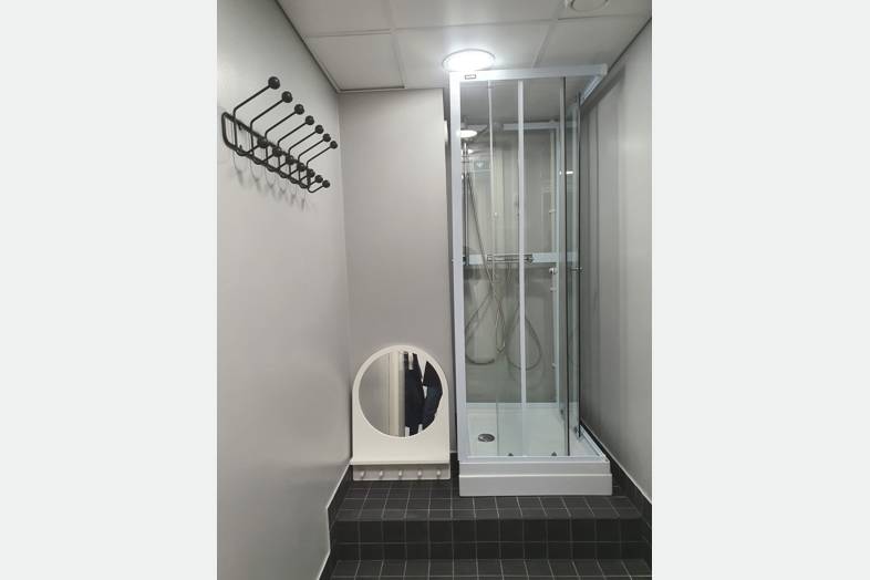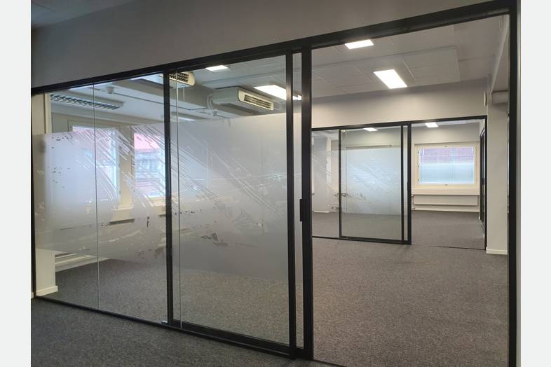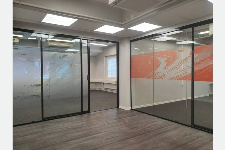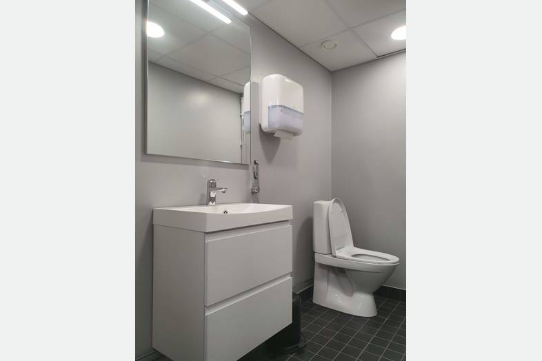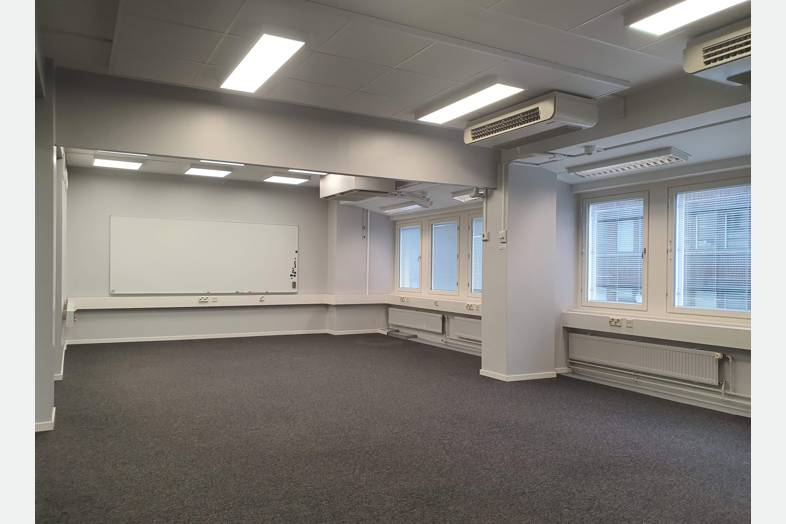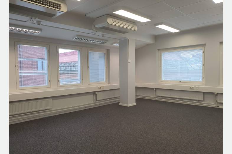 Tämä kustannustehokas 5. kerroksen toimistotila taipuu moneen. Tilakokonaisuuteen kuuluu erikokoisia huoneita lasiseinin ja ilman. Taukokeittiö sekä avokeittiö saarekkeella, 4 WC-tilaa ja pari erillistä suihkua pukeutumistiloilla.