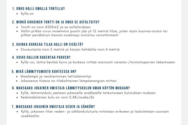 Myytävä tila käsittää 53.5m2 hallitilan missä mm. vesipiste, wc, valo- ja voimavirta, lattiakaivo hiekan- ja öljynerotuksella. Hallitilassa lisäksi mahdollisuus tehdä parvi. Tilan vapaa korkeus on 6m ja tilassa on sähkökäyttöinen nosto-ovi, mistä mahtuu sisään korkeampaakin kalustoa (mitat 4x4.3m). Kokonaisuudessaan hallitilan varustetaso on hyvä ja tarjoaa loistavat puitteet monenlaiselle yritystoiminnalle varastointiin, tuotantoon tai työtilaksi. Toimitilassa on harjoitettava arvonlisäverollista toimintaa. Tila lämmitetään maalämmöllä ja tilasta löytyy myös erillinen käyntiovi.