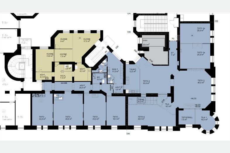 Valoisat ja modernit tilat. Paljon erikokoisia huoneita ja avotilaa. Tiloissa on jäähdytys.