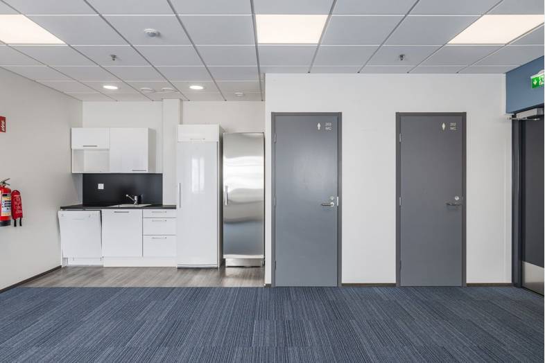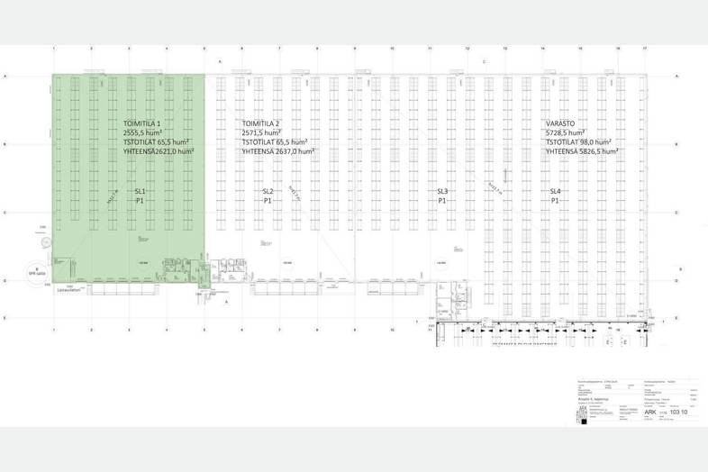 Toimitilan koko: varasto 2555,5 m² + parvitoimisto 65,5 m² sekä 1. kerroksen sosiaali- ja taukotilat 65,5 m².