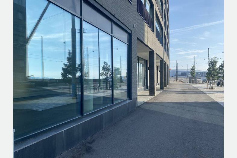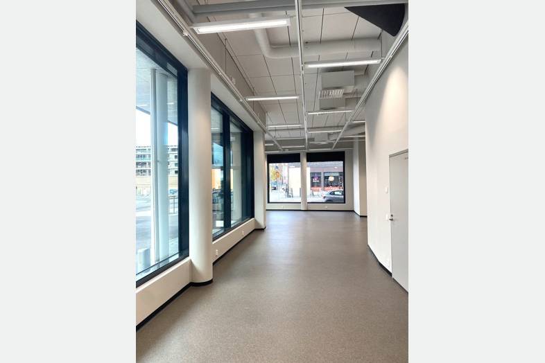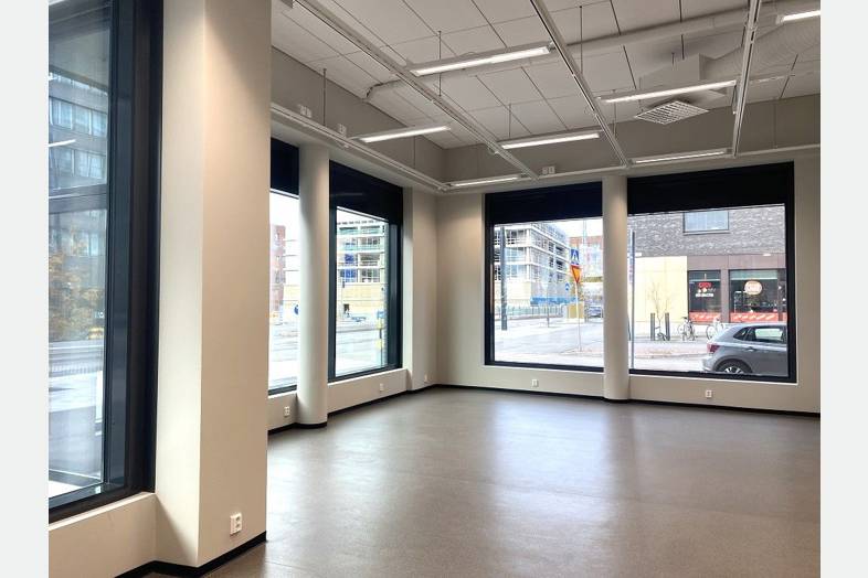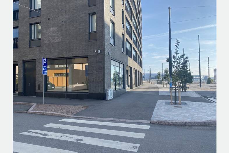 Isot ikkunat Atlantinkadun suuntaan ja kadun varressa pysäköintipaikkoja. Ruoholahden metroasemalle reilun vartin kävelymatka ja lähin raitiovaunupysäkki sijaitsee aivan tilan edustalla.