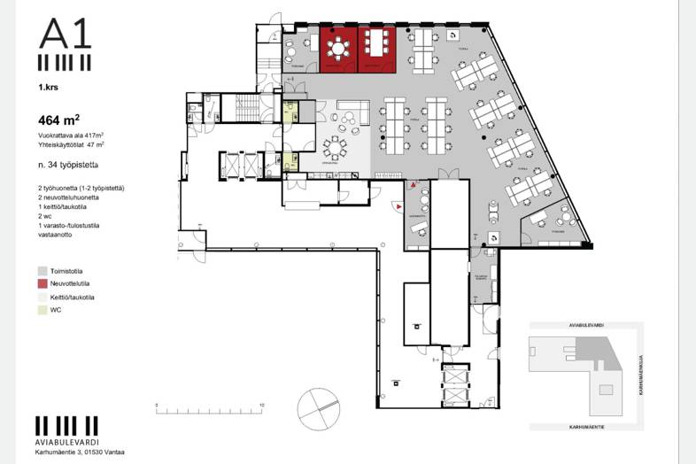 Vuokrataan ensimmäisen kerroksen 417m2 toimistotila + jyvitetyt yhteiskäyttötilat 47m2 .Aviabulevardin tyylikäs moderni toimistotalo sijaitsee juna-aseman välittömässä läheisyydessä, josta Helsinki-Vantaan lentokenttäterminaalit T1 ja T2 ovat vain minuutin junamatkan päässä. Lähemmäksi lentokenttää on vaikea päästä autollakaan kulkiessa.