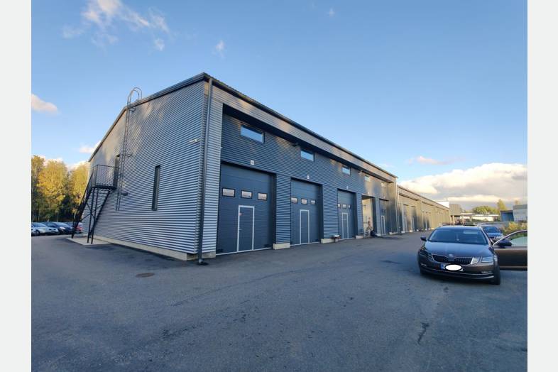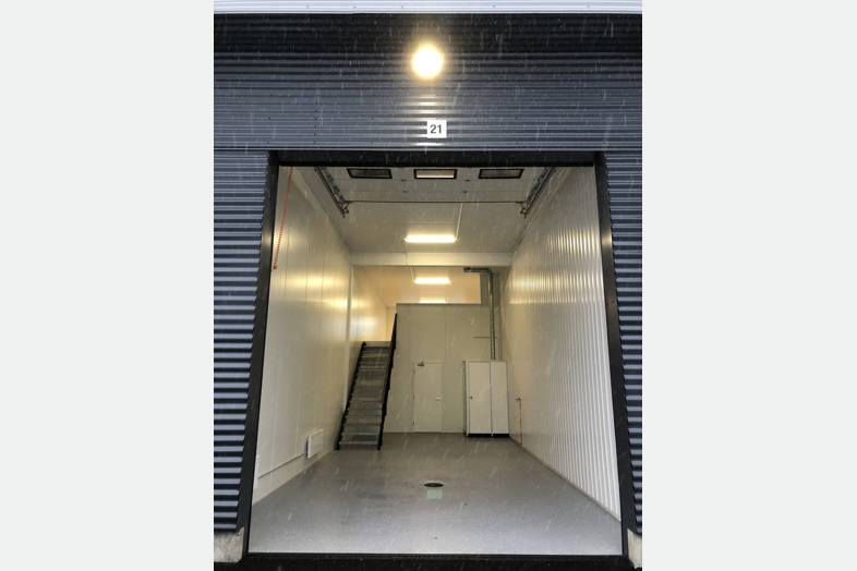 Moottoroitu nosto-ovi erillisellä käyntiovella. Autolla sisään ajettava tila. Tilamitat: 10,25 (Pituus) 4,40 (Leveys) 5,00 (Korkeus). Ovimitat: 3,45 (Leveys) 3,90 (Korkeus).