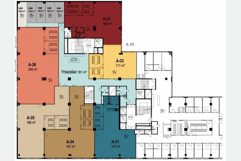 166 m² tila sijaitsee kiinteistön 3. kerroksessa ja koostuu avotilasta ja kahdesta huoneesta sekä wc-tiloista. Keittiö vuokralaisten yhteiskäytössä.