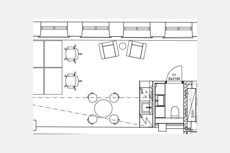 Tästä 5. kerroksen tilasta avautuu näkymät korttelin sisäpihalle.