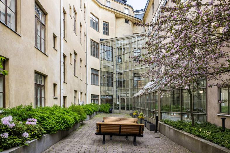 Tämä 195 m² toimistotila sijaitsee rauhallisella sisäpihalla, modernissa pihasiipirakennuksessa, joka täydentää arvokiinteistön historiallista kokonaisuutta. Tila on toisessa kerroksessa, ja sinne saavutaan oman sisäänkäynnin kautta vehreän sisäpihan läpi – jo saapuminen tilaan tarjoaa rauhoittavan hetken kaupungin vilinästä.