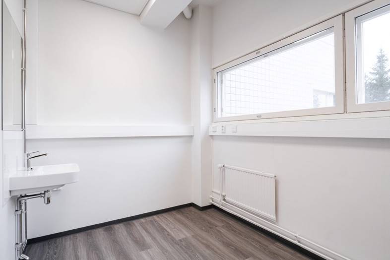 Valoisa 1. kerroksen 6,7 m2:n tila, jossa ikkuna järvimaisemalla. Tila on saneerattu täysin uutta vastaavaksi, tilassa on vesipiste, käytävällä wc ja odotustila. Tulossa yhteiset sosiaalitilat syksyllä 2024. Vuokra 390 € (sis. sähkö ja vesi).