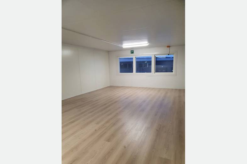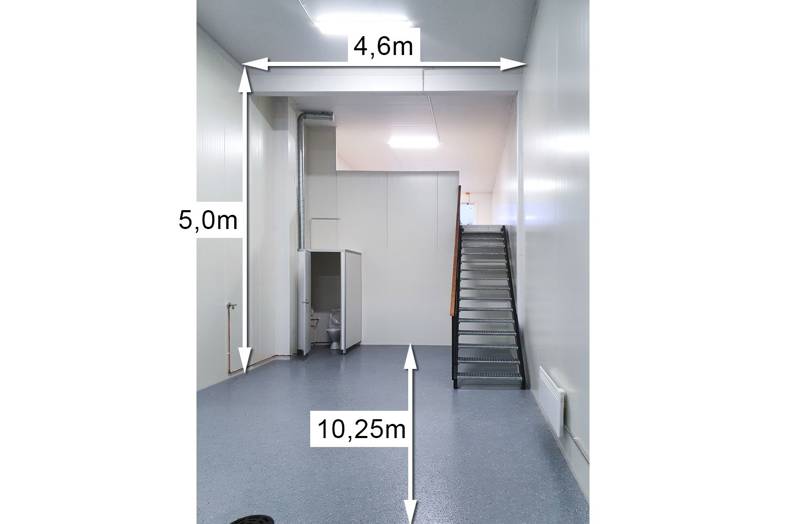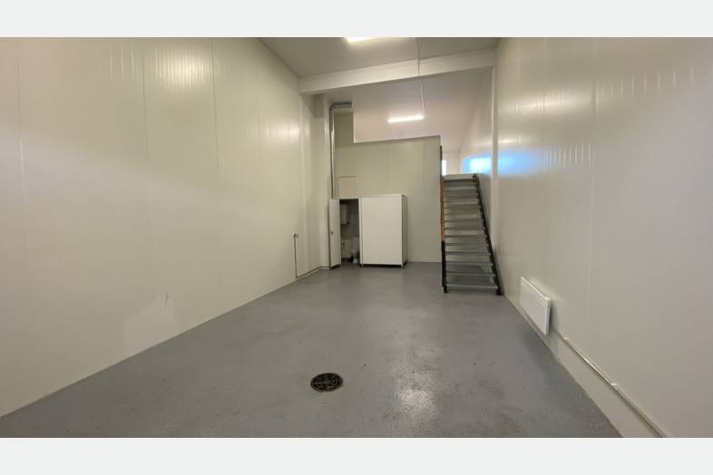 Moottoroitu nosto-ovi erillisellä käyntiovella. Autolla sisään ajettava tila. Tilamitat: 10,25 (Pituus) 4,60 (Leveys) 5,00 (Korkeus). Ovimitat: 3,45 (Leveys) 3,90 (Korkeus).